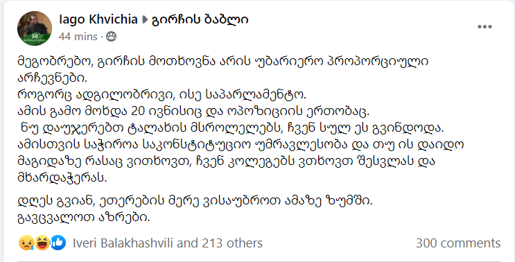 ამისთვის საჭიროა საკონსტიტუციო უმრავლესობა და თუ ის დაიდო მაგიდაზე რასაც ვითხოვთ, ჩვენ კოლეგებს ვთხოვთ შესვლას და მხარდაჭერას.” – წერს იაგო ხვიჩია.
