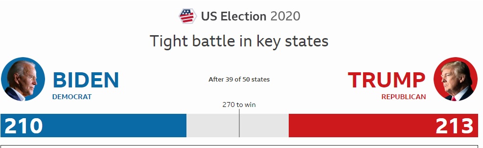 აშშ-ს საპრეზიდენტო არჩევნებში ამომრჩეველთა კოლეგიის ხმებით დონალდ ტრამპმა ჯო ბაიდენს გადაუსწრო. BBC-ის ინფორმაციით,   პრეზიდენტობის დემოკრატ კანდიდატს 210, მოქმედ პრეზიდენტს, დონალდ ტრამპს კი 213 ხმა აქვს.