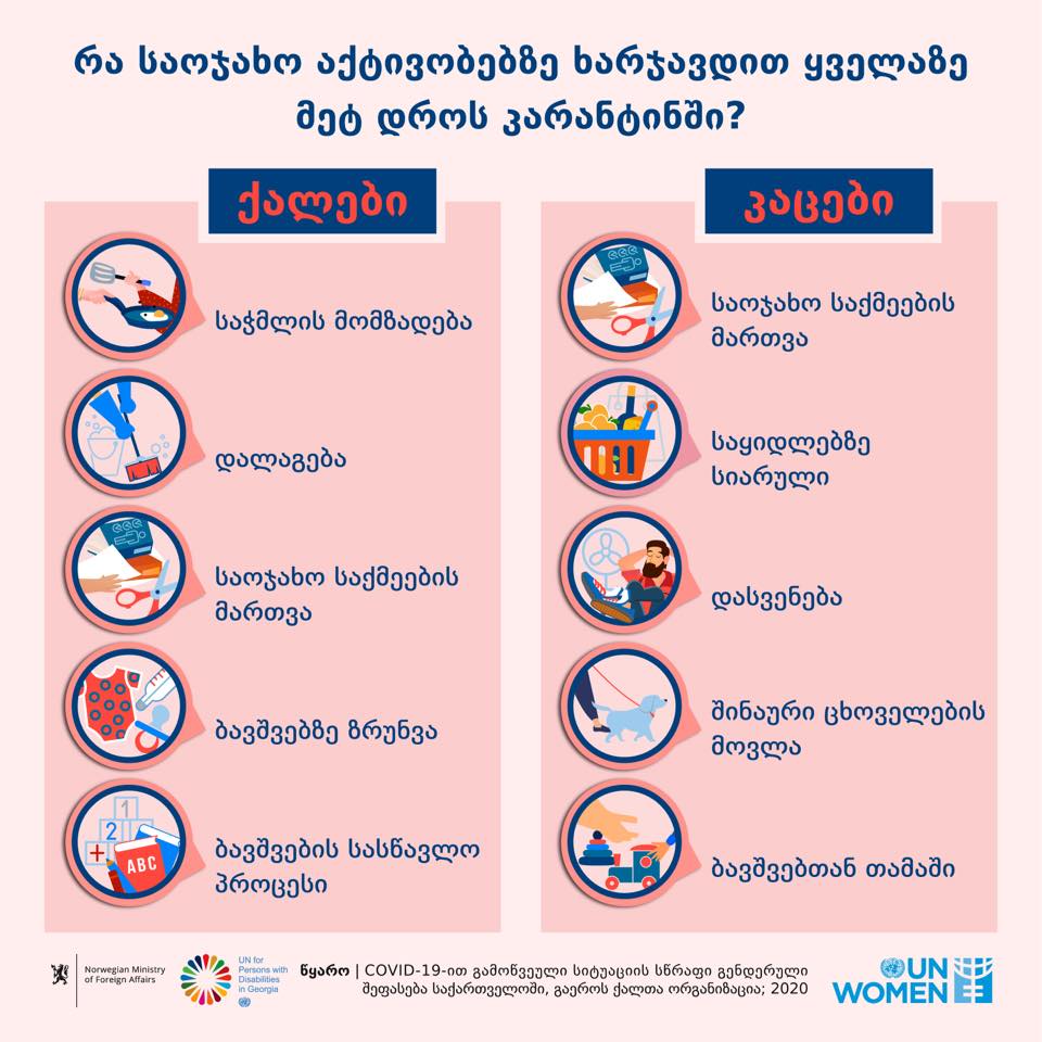 კვლევის თანახმად, კარანტინის დროს ქალების შემთხვევაში მთავარი საქმიანობების ჩამონათვალი ასეთია: საჭმლის მომზადება, დალაგება, სახლის საქმეების მართვა, ბავშვებზე ზრუნვა და ბავშვების სასწავლო პროცესში ჩართულობა. კაცების შემთხვევაში კი მთავარ საქმიანობებს სახლის საქმეების მართვა, საყიდლებზე სიარული, დასვენება, შინაური ცხოველების მოვლა და ბავშვებთან თამაში წარმოადგენდა.