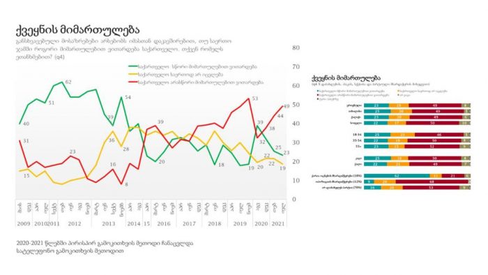 გამოკითხულთა 23 პროცენტი მიიჩნევს, რომ ქვეყანა სწორი მიმართულებით ვითარდება, ხოლო 19 პროცენტის აზრით, საქართველო საერთოდ არ იცვლება.