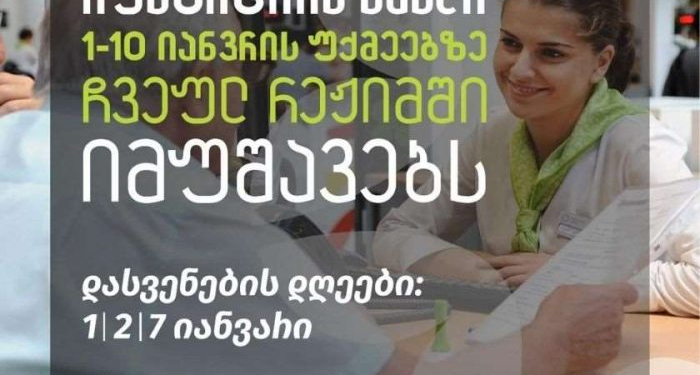 ფილიალები მხოლოდ 1 და 2 იანვარს, ასევე, შობის დღესასწაულზე – 7 იანვარს არ იმუშავებენ.