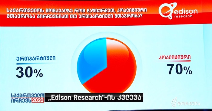 ტელეკომპანია „ფორმულას” დაკვეთით ჩატარებული Edison Research-ის კვლევის მიხედვით, კითხვაზე, „საქართველოს მომავალზე რომ დაფიქრდეთ, კოალიციური მთავრობა გირჩევნიათ თუ ერთპარტიული მთავრობა?”