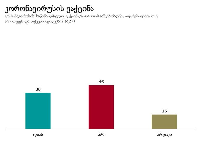 გამოქვეყნებული კვლევის მიხედვით,  გამოკითხულთა 46% ამბობს, რომ კორონავირუსის ვაქცინის არსებობის შემთხვევაში არ აიცრებოდა. ასევე, 15%-ს ამ კითხვაზე პასუხი არ აქვს.