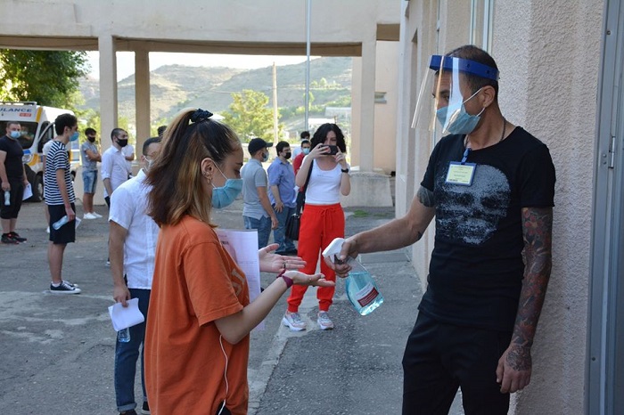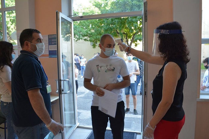 გთავაზობთ ფოტოებს, როგორ იცავენ აბიტურიენტები პანდემიის დროს დადგენილ წესებს გამოცდის პირველ დღეს: