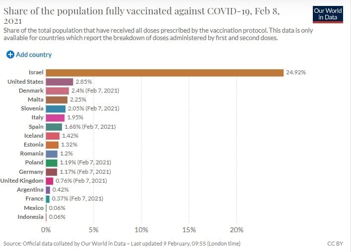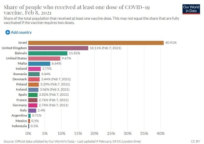 8 თებერვლის მონაცემებით, ისრაელში მოსახლეობის 40,91%-ს კორონავირუსის ვაქცინის ერთი დოზა მაინც აქვს გაკეთებული. დიდი ბრიტანეთში კი, 7 თებერვლის მონაცემებით, კოვიდის ერთი დოზა მოსახლეობის 18,11%-ს აქვს გაკეთებული.