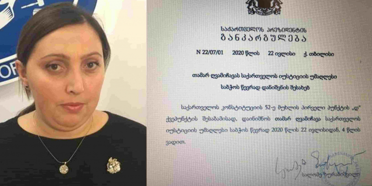 პრეზიდენტმა იუსტიციის უმაღლესი საბჭოს წევრად თამარ ღვამიჩავა დანიშნა, – ამის შესახებ იუსტიციის უმაღლესი საბჭოს არამოსამართლე წევრი, ნაზი ჯანეზაშვილი აცხადებს.