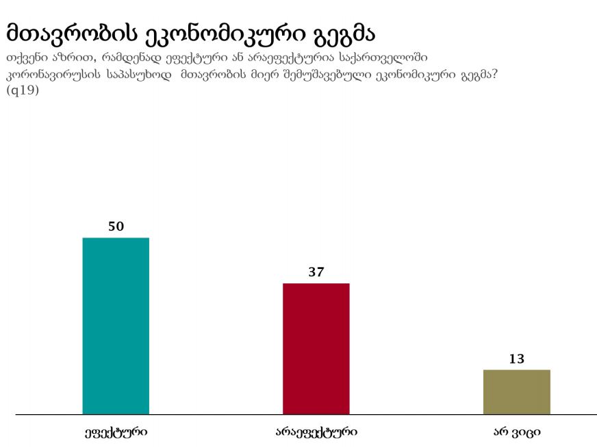 კვლევის მიხედვით, გამოკითხულთა 37% ფიქრობს, რომ მთავრობის ეკონომიკური გეგმა არაეფექტურია. ამასთან, 50% მხარს უჭერს ეკონიმიკური გეგმის ეფექტურობას.