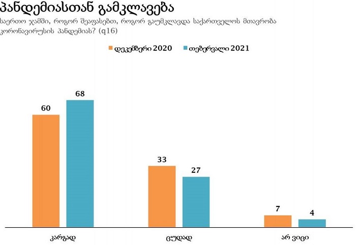 2021 წლის თებერვლის თვის მონაცემებით, გამოკითხულთა 68% მიიჩნევს, რომ საქართველოს მთავრობა კოვიდპანდემიას კარგად უმკვლავდება. 2020 წლის მონაცემებთან შედარებით, წელს შედეგი 8%-ით არის გაზრდილი.
