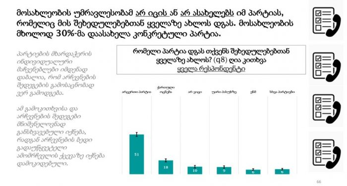 მოსახლეობის უმრავლესობამ არ იცის ან არ ასახელებს პარტიას, რომელიც მის შეხედულებებთან ყველაზე ახლოს დგას, – ამის შესახებ ამერიკის ეროვნულ-დემოკრატიული ინსტიტუტის (NDI) კვლევაშია ნათქვამი.